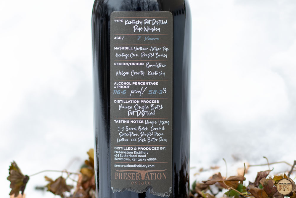 Preservation Distillery is best known for their portfolio of brands, consisting of sourced products, including Pure Antique, Very Olde St. Nick, Rare Perfection, Wattie Boone & Sons, and Old Man Winter, among others. For those brands, very little information is provided on the background of their source of distillation and often mashbill. The company changed that, with Preservation Estate Pot Distilled Wheated Bourbon, their first 100% in-house distilled product produced by Preservation Distillery. A little under a year later, they released their second in-house distilled product, Preservation Estate Pot Distilled Rye.