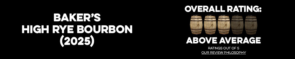Baker’s High Rye Bourbon was introduced in 2024 as a new brand extension for Jim Beam’s Baker’s line of bourbons. In 2025, the brand once again features its standard 7 year age statement and contains “twice the standard amount of rye in Baker’s Bourbon,” according to the company. Though Beam doesn’t disclose many of their mashbills, it is possible that it uses Old Grand-Dad’s high rye mashbill of 63% corn, 27% rye, and 10% malted barley. Additionally, the age is not a consistent 7 years, whereas the bottle we reviewed last year was aged 7 years, 9 months; this release is aged 3 months less. Interestingly, the company considers the 2025 edition, a re-release of the 2024 edition, even leaving 2024 on the neck label.