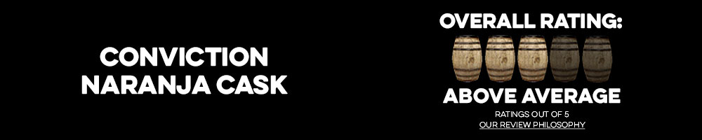 Conviction Naranja Cask opens up with an incredibly pleasing aroma. Orange marmalade and marzipan mingle with graham cracker and toasted oak scents. Syrup and faint maraschino cherry bring additional sweet scents. The sweetness from the nose appears at the midpoint in the form of syrup soaked cherry and rock candy. A sweet orange rind note accentuates aged oak and leather. The silk mouthfeel quickly morphs at the end of the sip as the finish turns noticeably dry, and highlights the bourbon's time in multiple barrels.
