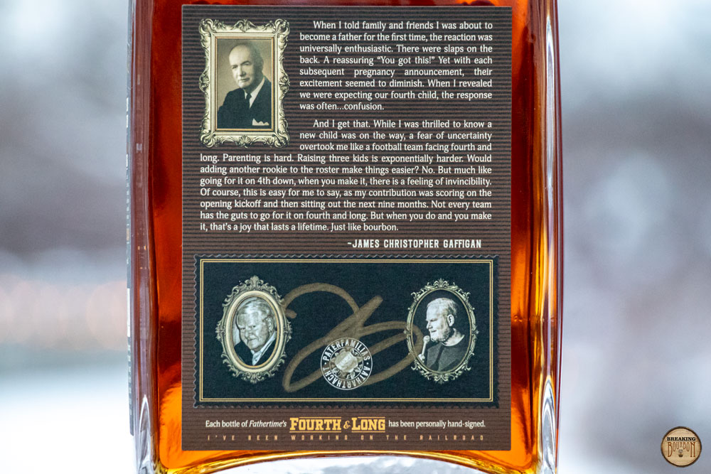 Gaffigan is planning five releases in the series, with each release representing one of his five children, though they are not personally identified with each release. As Gaffigan states, “while I was thrilled to know a new child was on the way, a fear of uncertainty overtook me like a football team facing fourth and long. Parenting is hard. Raising three kids is exponentially harder. But much like going for it on fourth down, when you make it, there is a feeling of invincibility.” Gaffigan goes on to state, “The same principles that inspired the previous versions of Fathertime have also guided the creation of our new release, Fourth & Long. This endeavor is still just me and Stu tasting barrels and putting together a smooth and delicious bourbon. Each bottle is personally signed by me, which was a pain in the ass but totally worth it - much like fatherhood.”