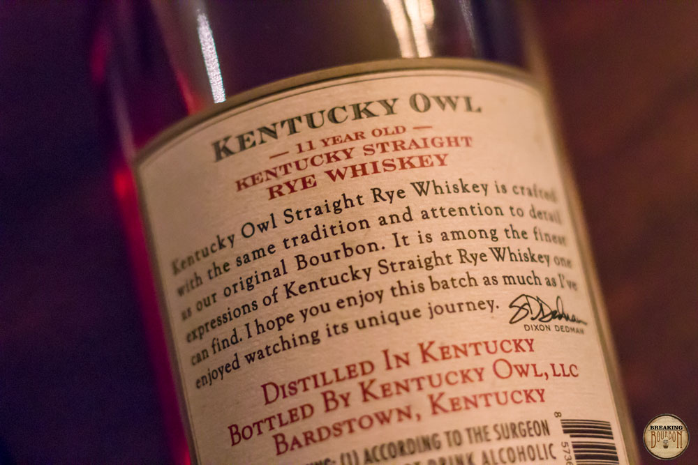 Kentucky Owl Rye Batch 1 is the company’s first foray into rye. Kentucky Owl is well known for their extremely limited run bourbon releases which have ranged from 194 to 2,535 bottles per release. Unlike their bourbon releases, Kentucky Owl hasn’t disclosed how many barrels were used in this release or how bottles were introduced to the market. It is rumored, however, that there are 7,000+ bottles in this release. This release is limited to half the country, including California, Colorado, the District of Columbia, Florida, Georgia, Illinois, Indiana, Kentucky, Louisiana, Maryland, Massachusetts, Michigan, Minnesota, Missouri, New Hampshire, New Jersey, New York, North Carolina, Ohio, Pennsylvania, South Carolina, Tennessee, Texas, Virginia, Washington, and Wisconsin.